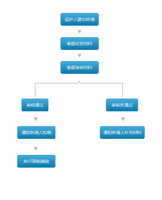 3.在收到邮件后,公司即开始启动监护机制审核流程并将于10个工日内予以回应。如果通过审核,我司将会通知申请人准备执行限制措施。如果审核未通过,我司会与申请人联系,告知需要补充何种资料。
